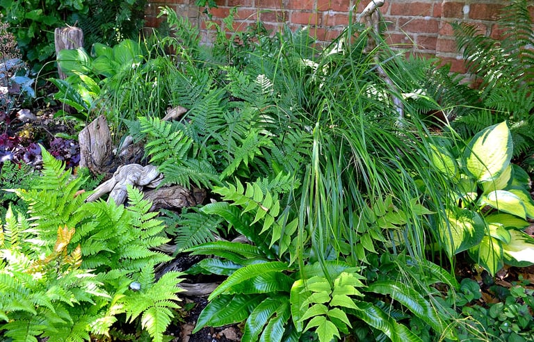 How to enliven a tired overgrown and neglected area with some shade loving plants and a bit of a stumpery!